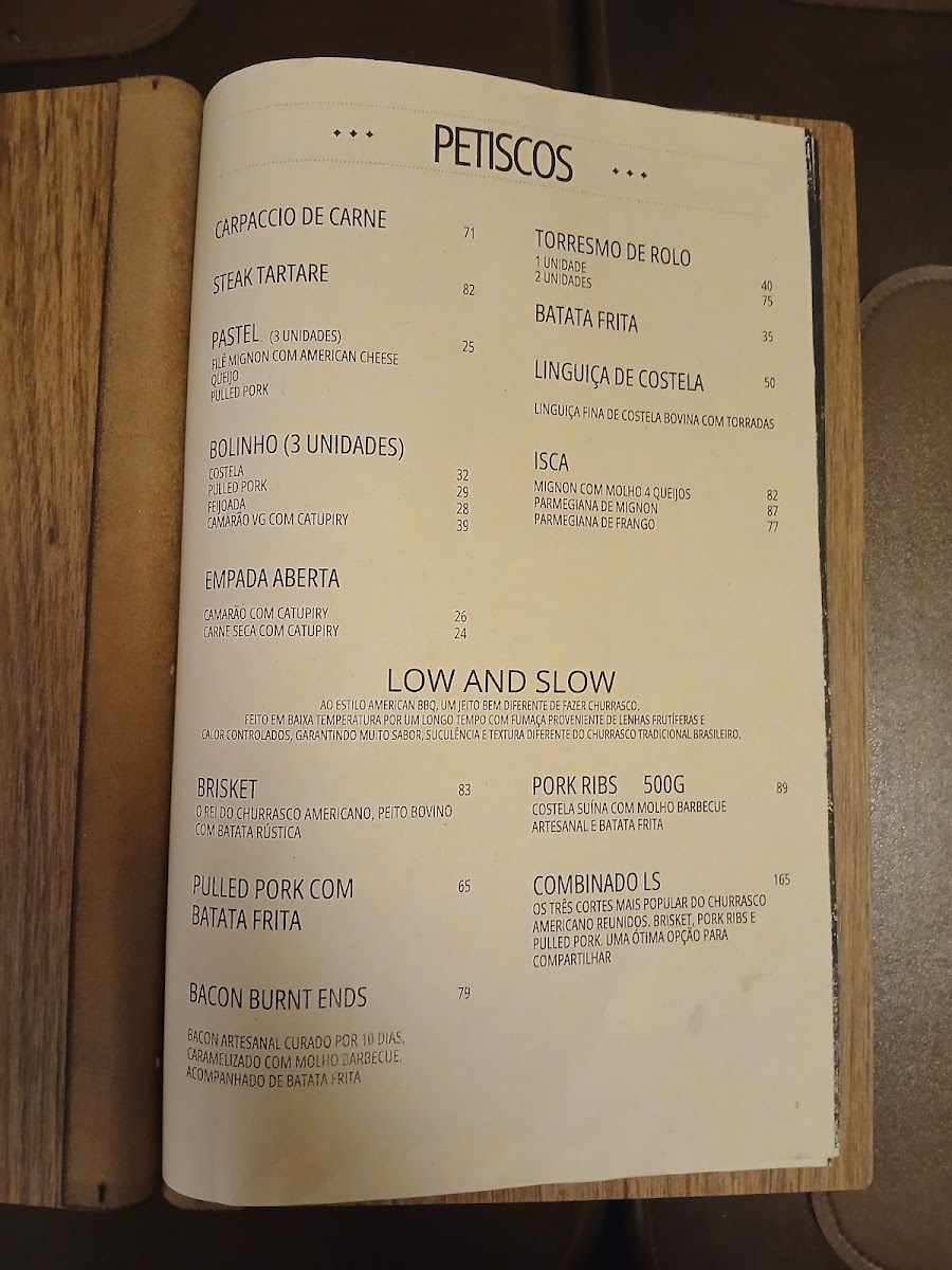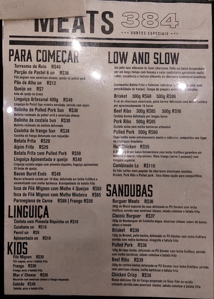 In conclusion, the menu at Restaurante Meats384 reflects a strong focus on quality cuts of meat and a classic Brazilian steakhouse experience, with flavors that are both rich and well-balanced. The highlight of the menu is undoubtedly the Picanha, which stands out for its tenderness, juicy texture, and perfectly seasoned crust, making it a must-try for anyone visiting the restaurant. Alongside the main meats, the menu offers well-paired sides and accompaniments that complement the dishes without overpowering them, creating a satisfying and cohesive dining experience. Overall, the menu is concise yet carefully curated, emphasizing quality over quantity, and it successfully delivers a memorable meal for those who appreciate expertly prepared grilled meats.